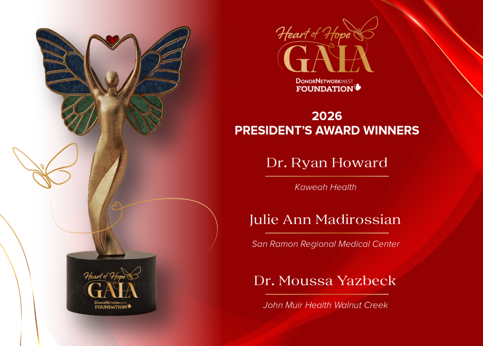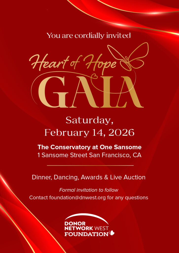 Join us for the Heart of Hope Gala on Valentine’s Day 2026—a celebration of love, life, and the incredible gift of organ, eye, and tissue donation. Coinciding with National Donor Day and National Heart Month, this elegant evening hosted by the Donor Network West Foundation will bring together hospital partners, community leaders, and supporters to honor the heroes, advocates, and innovators who make lifesaving transplants possible. Guests will enjoy a night of inspiration and recognition as we present eight prestigious awards celebrating extraordinary contributions to the donation and transplantation community. More than a gala, Heart of Hope is a heartfelt fundraiser that fuels our mission to save and heal lives—one donor, one recipient, and one act of hope at a time.